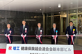 健保連は5日、東京・千駄ヶ谷に完成した新本部ビルの竣工式を行った。宮永俊一会長や建設に携わった関係者らはエントランス前でテープカットした後、地下1階の大会議室で神事に参列した。