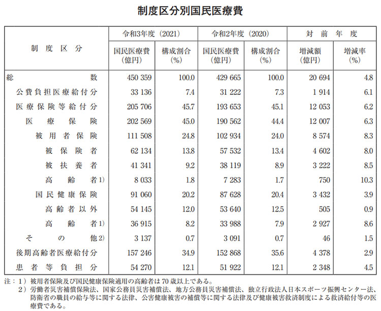 厚生労働省は10月24日、令和3年度の国民医療費が過去最高の45兆359億円(前年度に比べ2兆694億円、4.8%の増加)だったと公表した。