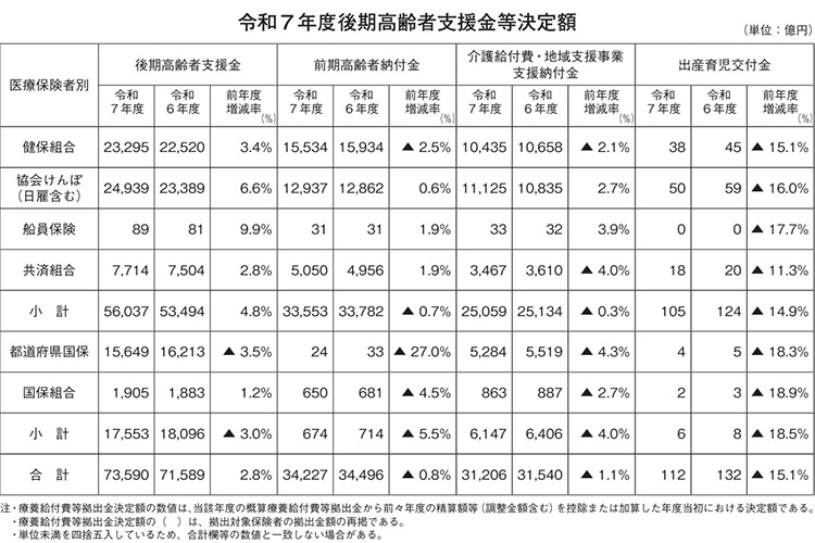 社会保険診療報酬支払基金(神田裕二理事長)は4月22日の記者会見で、医療保険者別の令和7年度の①後期高齢者支援金②前期高齢者納付金③介護給付費・地域支援事業支援納付金④出産育児交付金──の決定状況を公表した。健保組合が納付する①後期支援金は前年度比3.4%増の2兆3295億円となった。