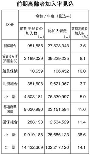 7年度の前期高齢者の加入者数(見込み)は1442万2369人(前年度比50万9202人減)、全国平均加入率は14.1%(同0.4ポイント低下)と見込んだ。健保組合は、前期高齢者数95万1885人(同1万5206人増)、総加入者数2757万3343人、前期高齢者加入率3.5%(同0.1ポイント増加)で、全国平均との差相当分を納付金として負担する。