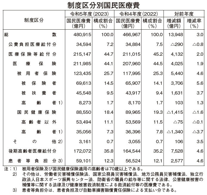 厚生労働省は10日、令和5年度の「国民医療費の概況」を公表した。5年度の1年間に保険診療にかかった医療費の総額(国民医療費)は、前年度比1兆3948億円、3.0%増の48兆915億円となった。1人あたり医療費は1万3000円、3.5%増の38万6700円で、いずれも過去最高を更新した。
