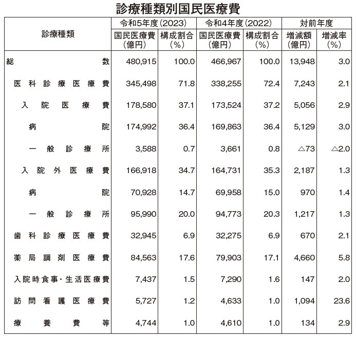 診療種別の国民医療費は、▽医科診療34兆5498億円(国民医療費全体の71.8%)▽歯科診療3兆2945億円(同6.9%)▽薬局調剤8兆4563億円(同17.6%)▽入院時食事・生活7437億円(同1.5%)▽訪問看護5727億円(同1.2%)▽療養費等4744億円(同1.0%)──。