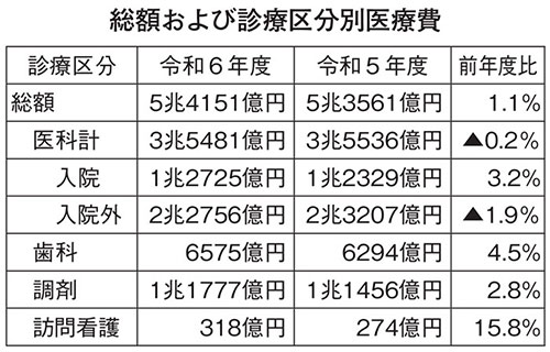 診療種類別にみると、▽医科入院1兆2725億円(前年度比3.2%増)▽医科入院外2兆2756億円(同1.9%減)▽歯科6575億円(同4.5%増)▽調剤1兆1777億円(同2.8%増)▽訪問看護318億円(同15.8%増)─で、医科入院外のみ前年度から減った。訪問看護は二桁を超える高い伸び率となった。