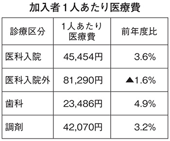 加入者1人あたり医療費は、▽医科入院4万5454円(同3.6%増)▽医科入院外8万1290円(同1.6%減)▽歯科2万3486円(同4.9%増)▽調剤4万2070円(同3.2%増)。