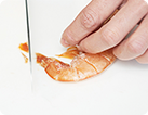 - タラは半分に切り、塩・こしょうを片面にして、薄力粉を両面にまぶす。エビは背ワタを取り、尾の先を斜めに切る。