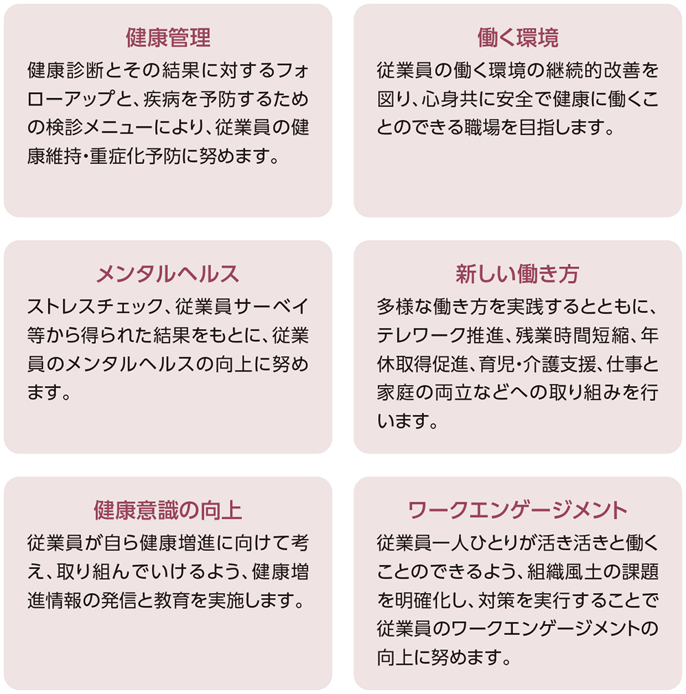 健康経営推進のため、2022年に「健康管理」「働く環境」「メンタルヘルス」「新しい働き方」「健康意識の向上」「ワークエンゲージメント」という6つの重点取り組み項目を設定しています(図)。体系立てて対策を講じ、PDCAサイクルを回せるようになりました。1つひとつの対策がどこに効いていくのか、次の課題は何かといった分析ができることで、健康経営の取り組みをさらに磨いていくことにつながりつつあると感じています。